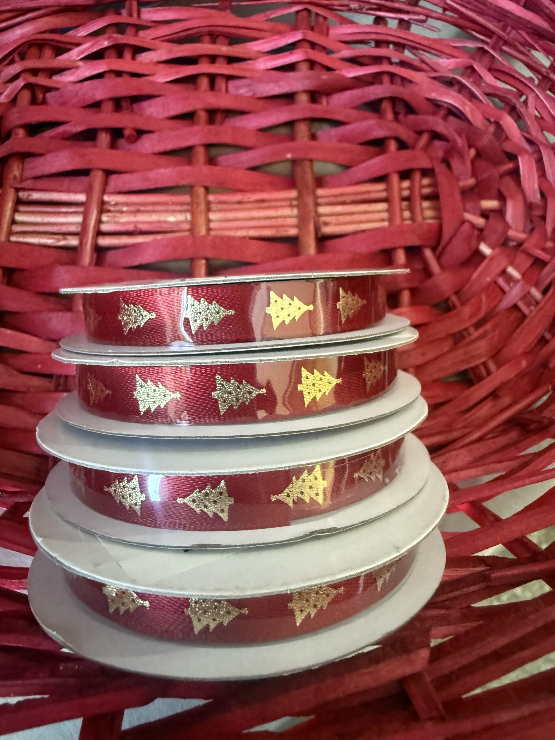 Κορδέλα σατέν χριστουγεννιάτικη μπορντώ με σχέδιο χρυσά έλατα 10mm x 9,144m(10 γιάρδες)