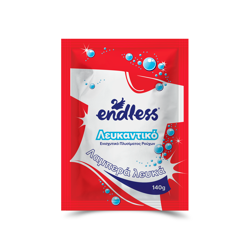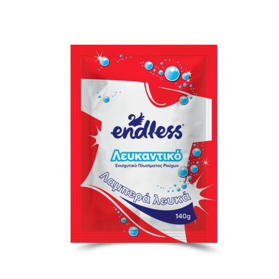 Λευκαντικό πλύσης με ευχάριστο άρωμα, χρησιμοποιείται μαζί με το απορρυπαντικό για πιο αστραφτερά λευκά, σε σακκουλάκι Endless 140 γραμμαρίων.