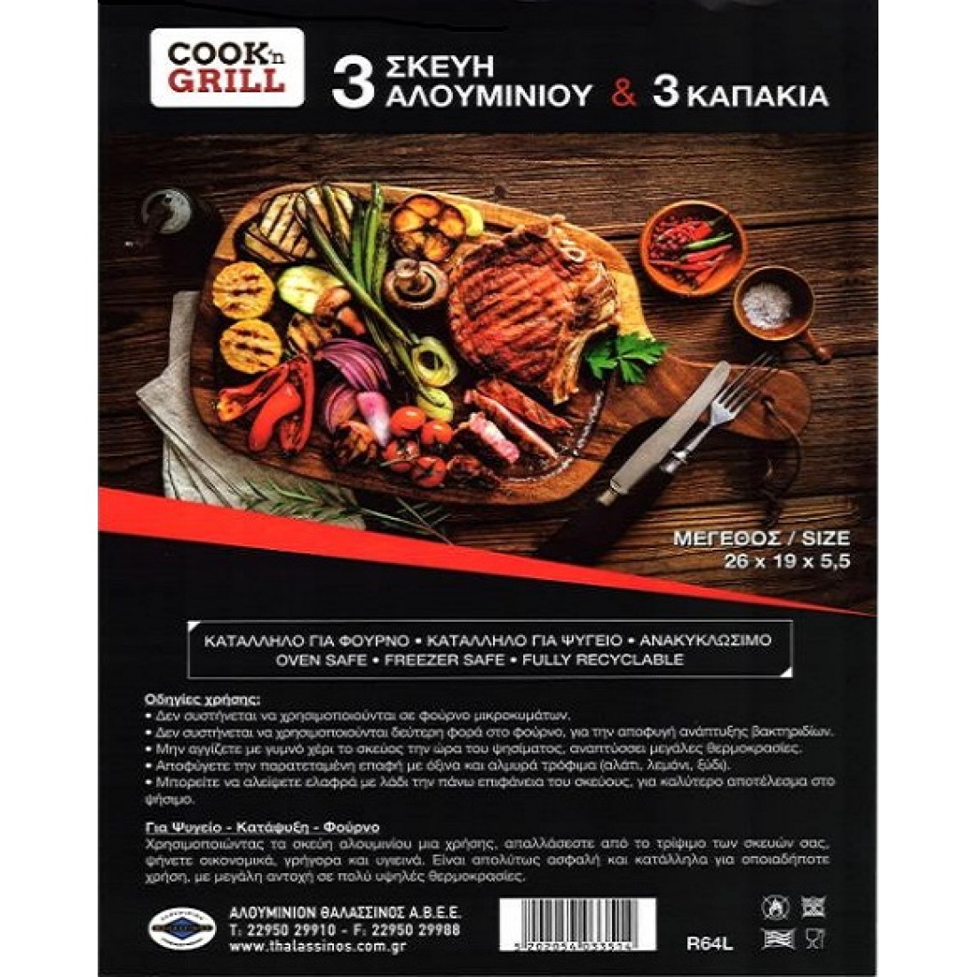 ΣΚΕΥΟΣ ΑΛΟΥΜΙΝΙΟΥ  ΣΕΤ R64 ΜΕ ΚΑΠΑΚΙ, μιας χρήσης, κατάλληλο για επαφή με τρόφιμα, επαγγελματική και οικιακή χρήση, διαστάσεις:26x19cm, βάθος 5,6cm,  συσκευασία 100τμχ